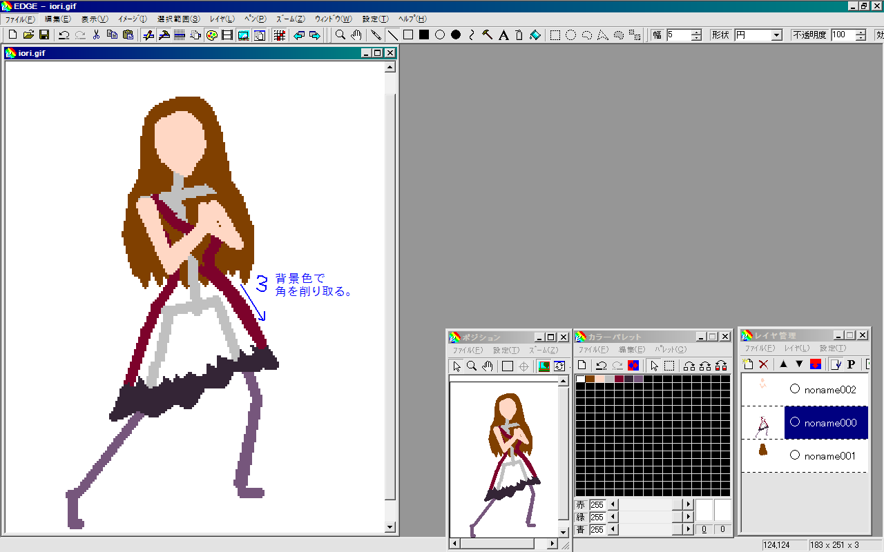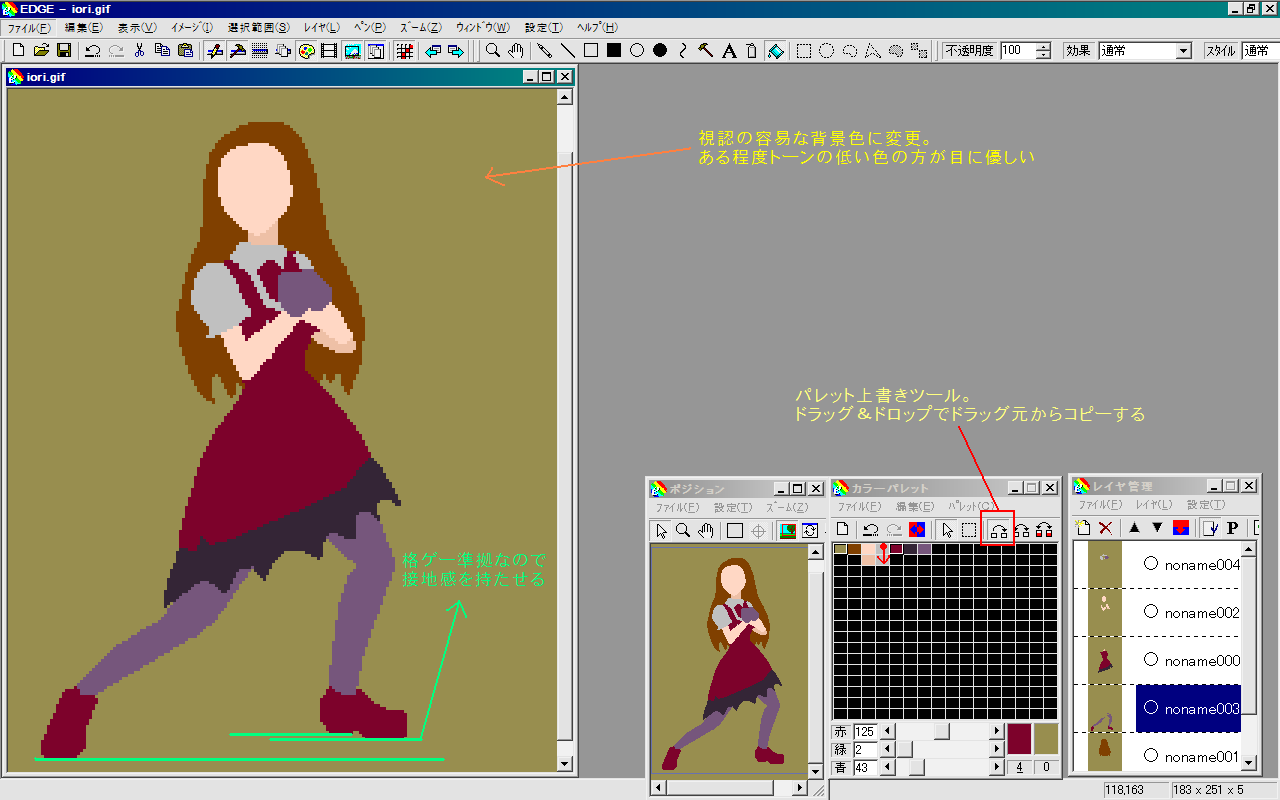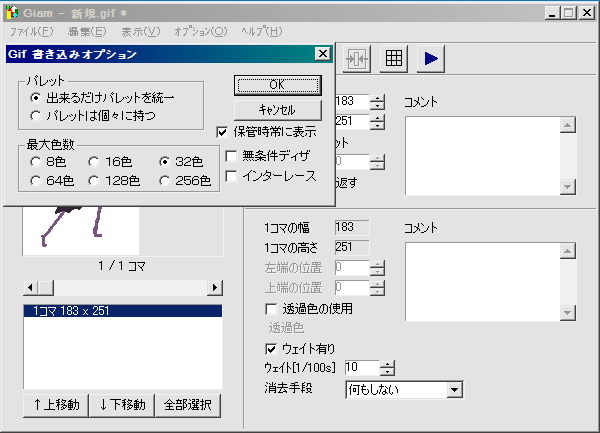 ここではgiamに放りこんで変換しました。 減色ソフトじゃなくていいですからね?ラフで256色も使ってるわけがないですから。