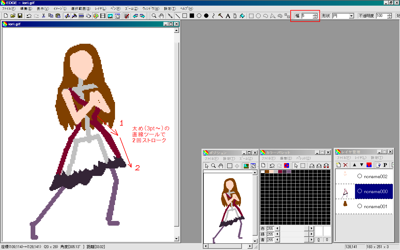 僕の作業は基本的に3pt以上の直線ツールをメインで使って、1ptの自由曲線ツールで細かい修正をしています。