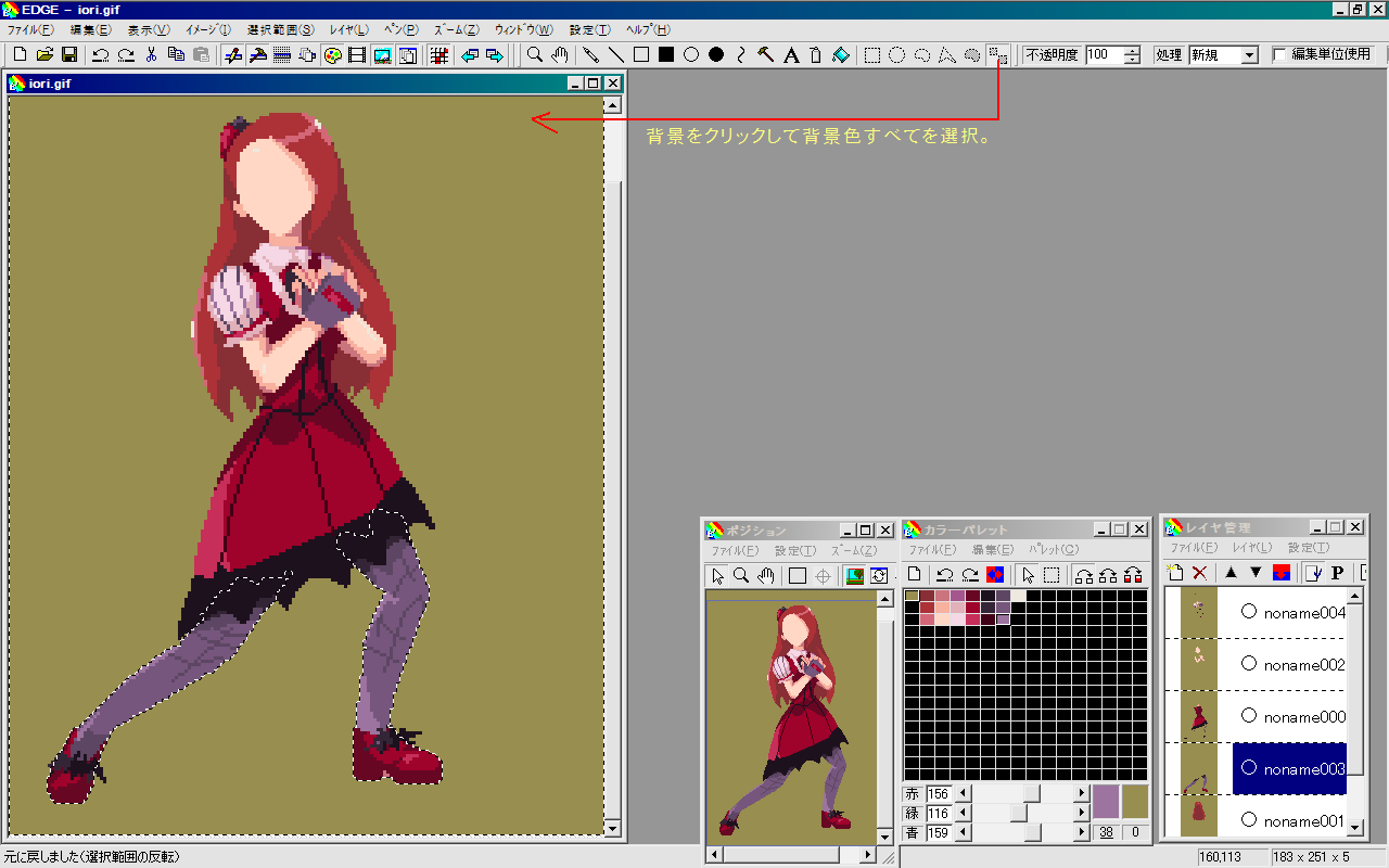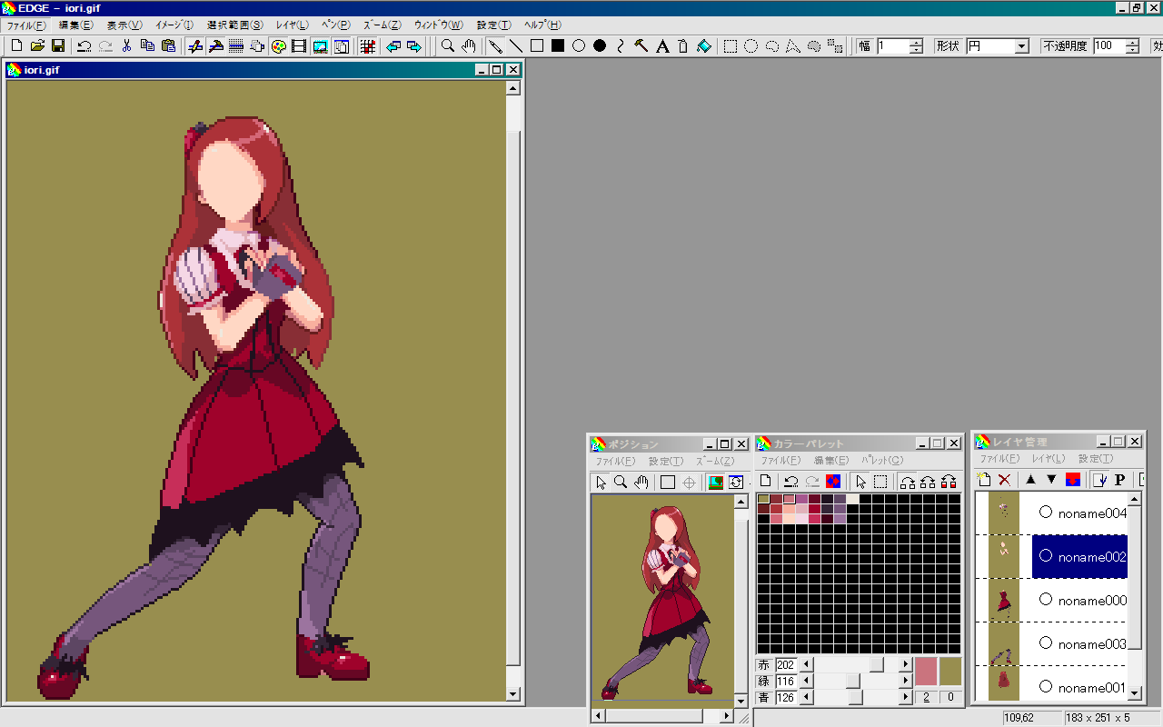 まずは放り込んだいおりん画像を3階層くらい(肌(最前面)と体と髪の毛(再背面))にレイヤー分けします。