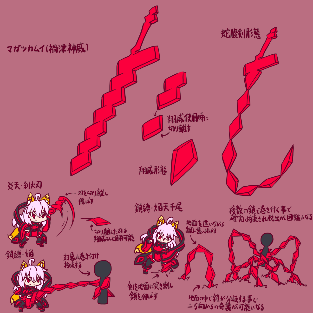 カムイの蛇腹剣形態を使い、複数の鎖で相手を拘束し完全に相手の動きを封じる事の出来る鎖縛・焔の強化版。