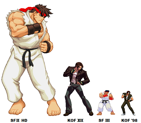 上の図は既存格闘ゲームのドットを作品別に並べてみたもので、右端が格ゲー黎明期の頃のキャラクターサイズです。